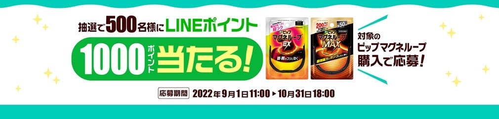 「ピップマグネループ」シリーズは2022年9月1日(木)より、LINEを活用したキャンペーンを実施します。レシート有効期間中に対象商品1点をお買い上げいただき、応募期間内にピップマグネループLINE公式アカウントから、レシートを撮影して応募すると、抽選で500名様にLINEポイント1000ポイントが当たります。