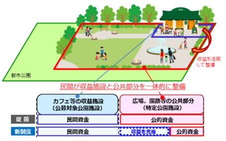 飲食店、売店等の公園利用者の利便の向上に資する公募対象公園施設の設置と、当該施設から生ずる収益を活用してその周辺の園路、広場等の一般の公園利用者が利用できる特定公園施設の整備・改修等を一体的に行う者を、公募により選定する制度。