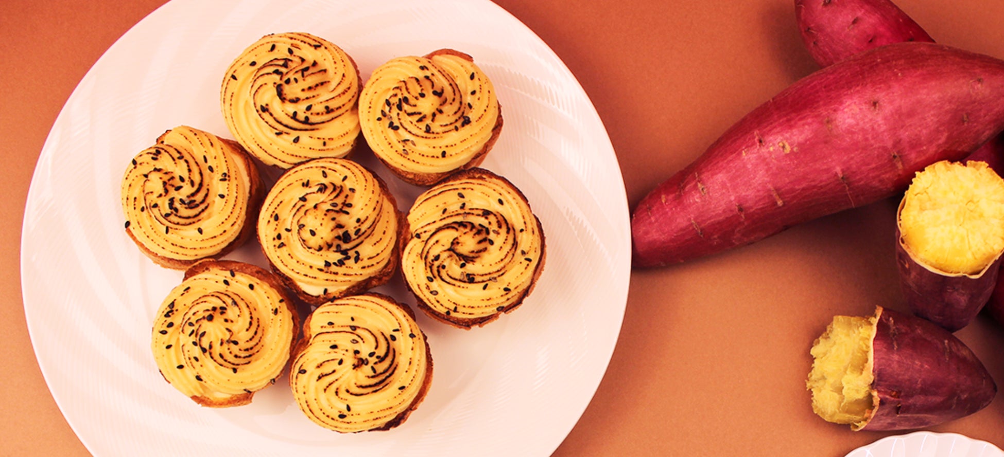 濃厚でなめらかなカスタードクリームに、低温でじっくりと焼き上げ、焼き芋にしてからペースト状にしたさつまいもを合わせ、食感のアクセントにダイス状のさつまいもを加えました。