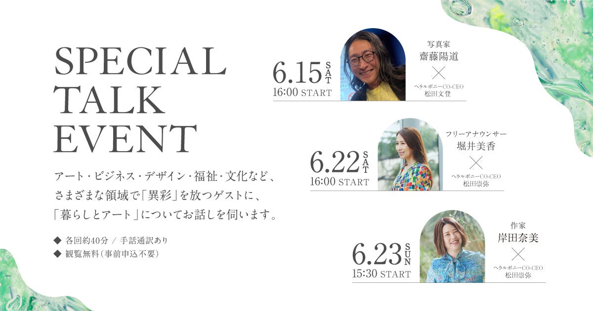 内容:「そのアートはあなたを表現者にする」をコンセプトに、アートを体感する多様なイベントを開催。ヘラルボニーが契約する作家の異彩作家アートの展示販売やワークショップ、トークイベントを行います。販売商品については後日発表いたします。