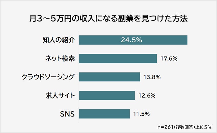 「月3~5万円の収入になる副業を見つけた方法」の1位は「知人の紹介(24.5%)」。2位「ネット検索(17.6%)」、3位「クラウドソーシング(13.8%)」、4位「求人サイト(12.6%)」、5位「SNS(11.5%)」でした。