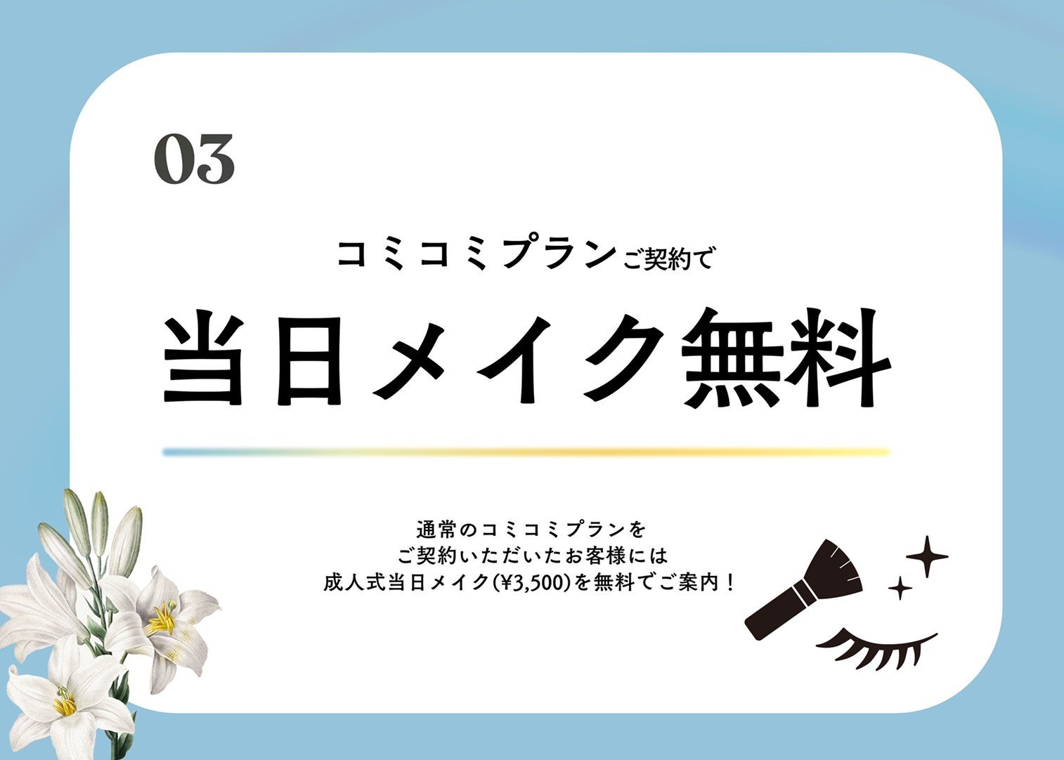 通常のコミコミプランをご契約いただいたお嬢様には、当日メイク(¥3,500)を無料でご案内いたします。