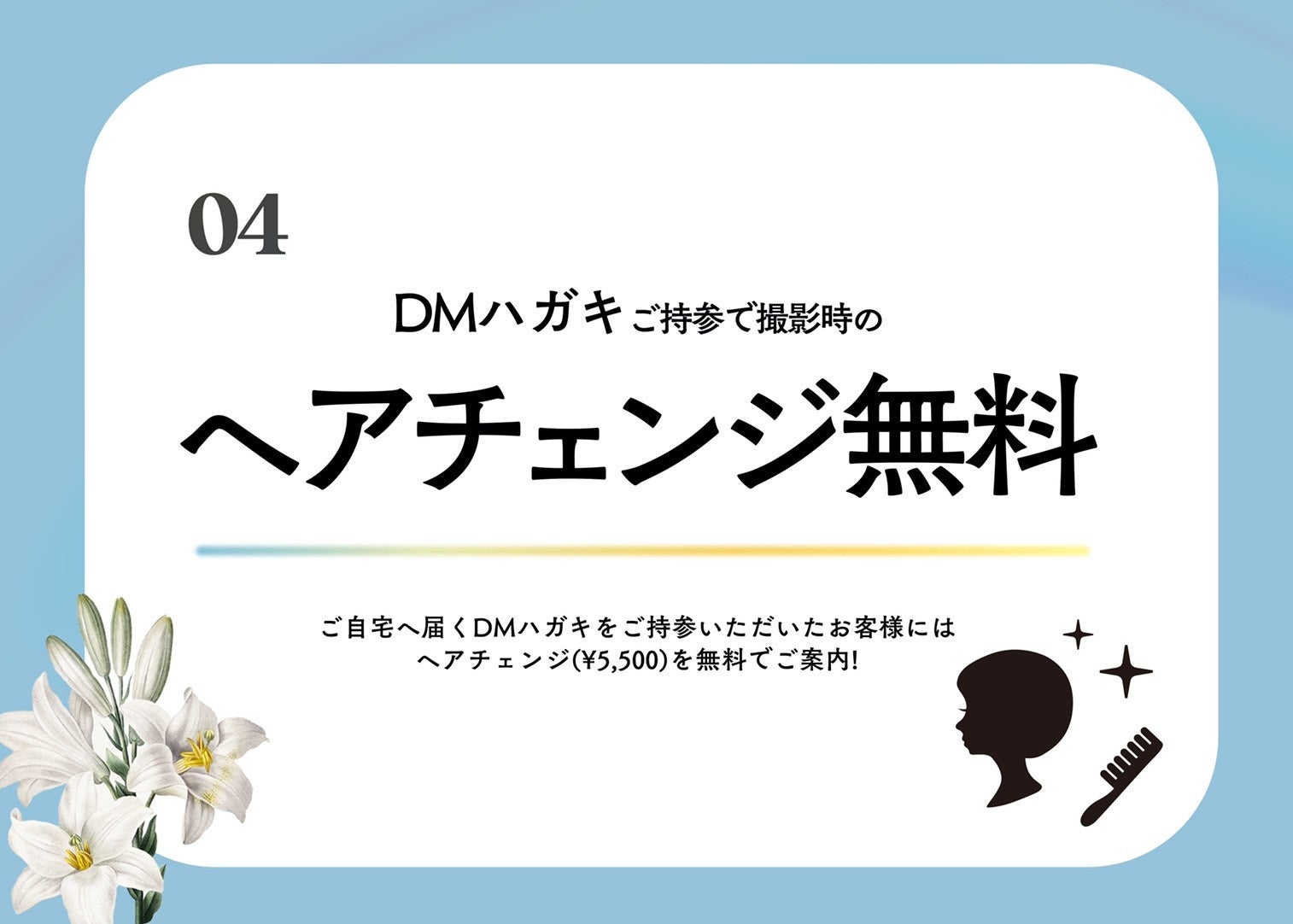 ④全プラン対象!DMはがきご持参で前撮り時のヘアチェンジが無料!