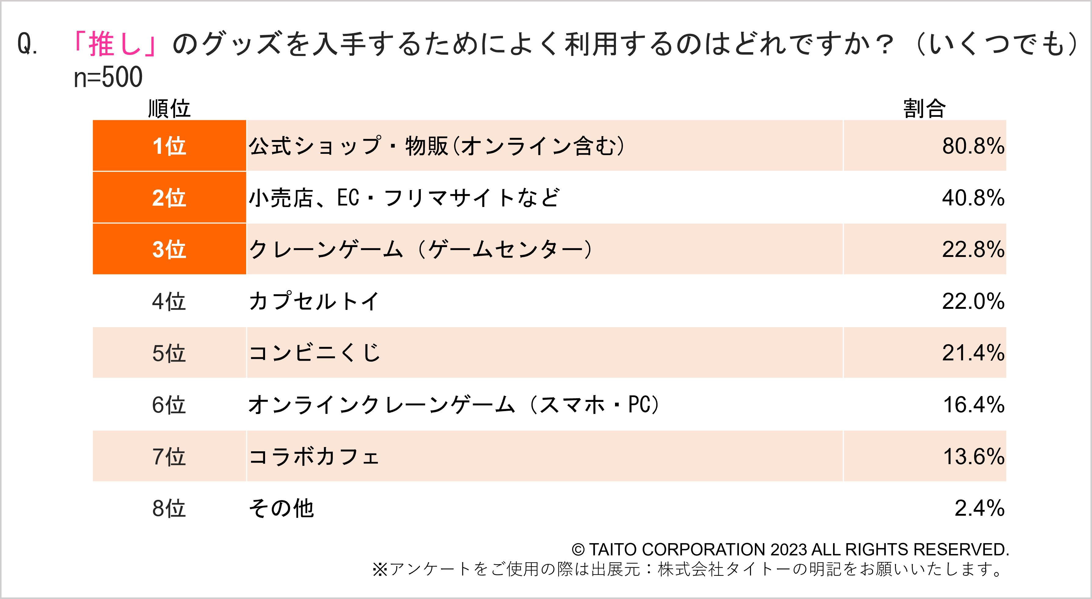 3位の「クレーンゲーム(ゲームセンター)」(24.9%)と、クレーンゲームのウェブ版である6位「オンラインクレーンゲーム(スマホ・PC)」(18.2%)を合計すると43.1%となり、1位「公式ショップ・物販(オンライン含む)」に次いで多い結果となりました。「推し活グッズ」の入手経路として、人気キャラクターやトレンドに合わせたグッズを取り揃えているクレーンゲームの人気の高さがうかがえる結果となりました。