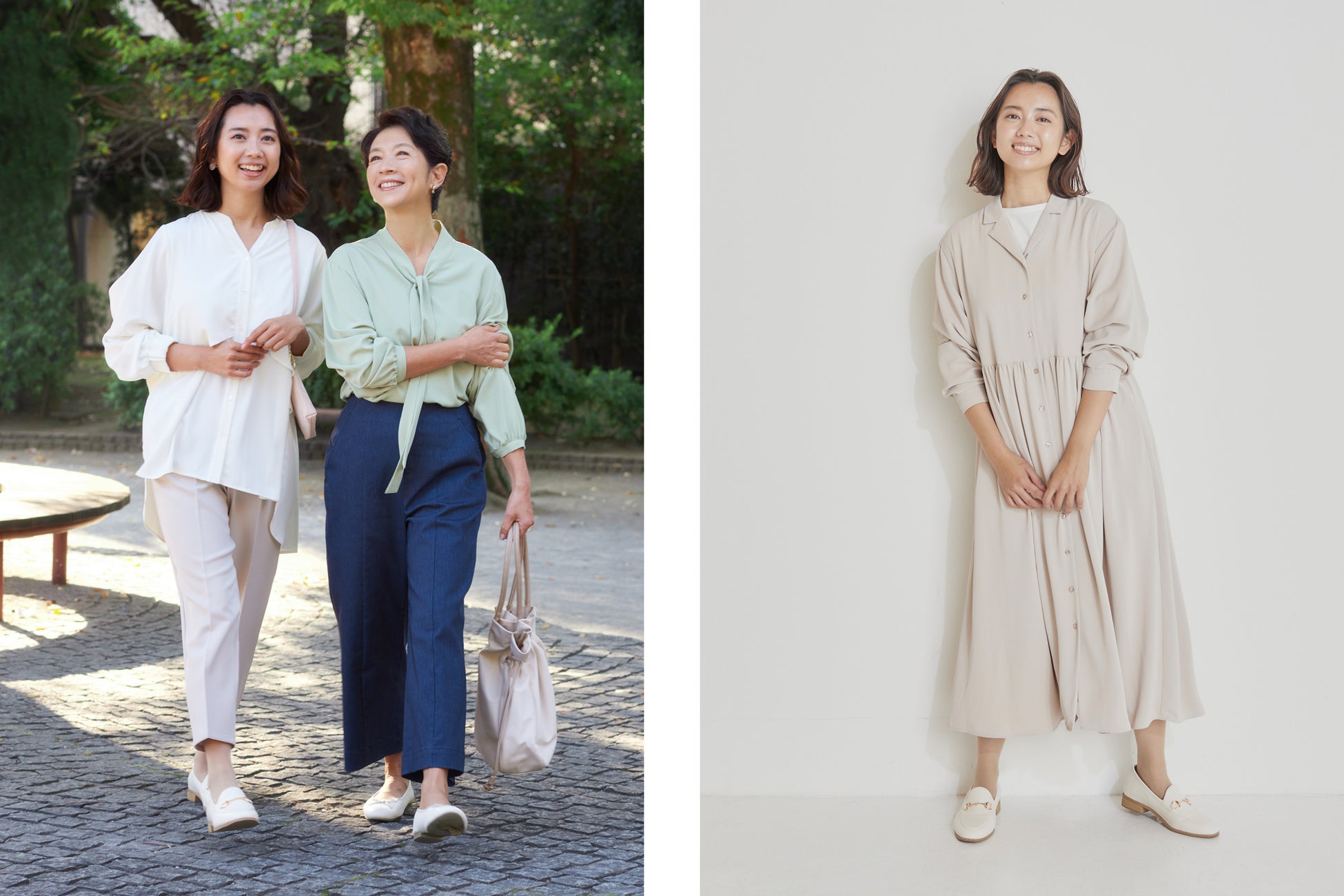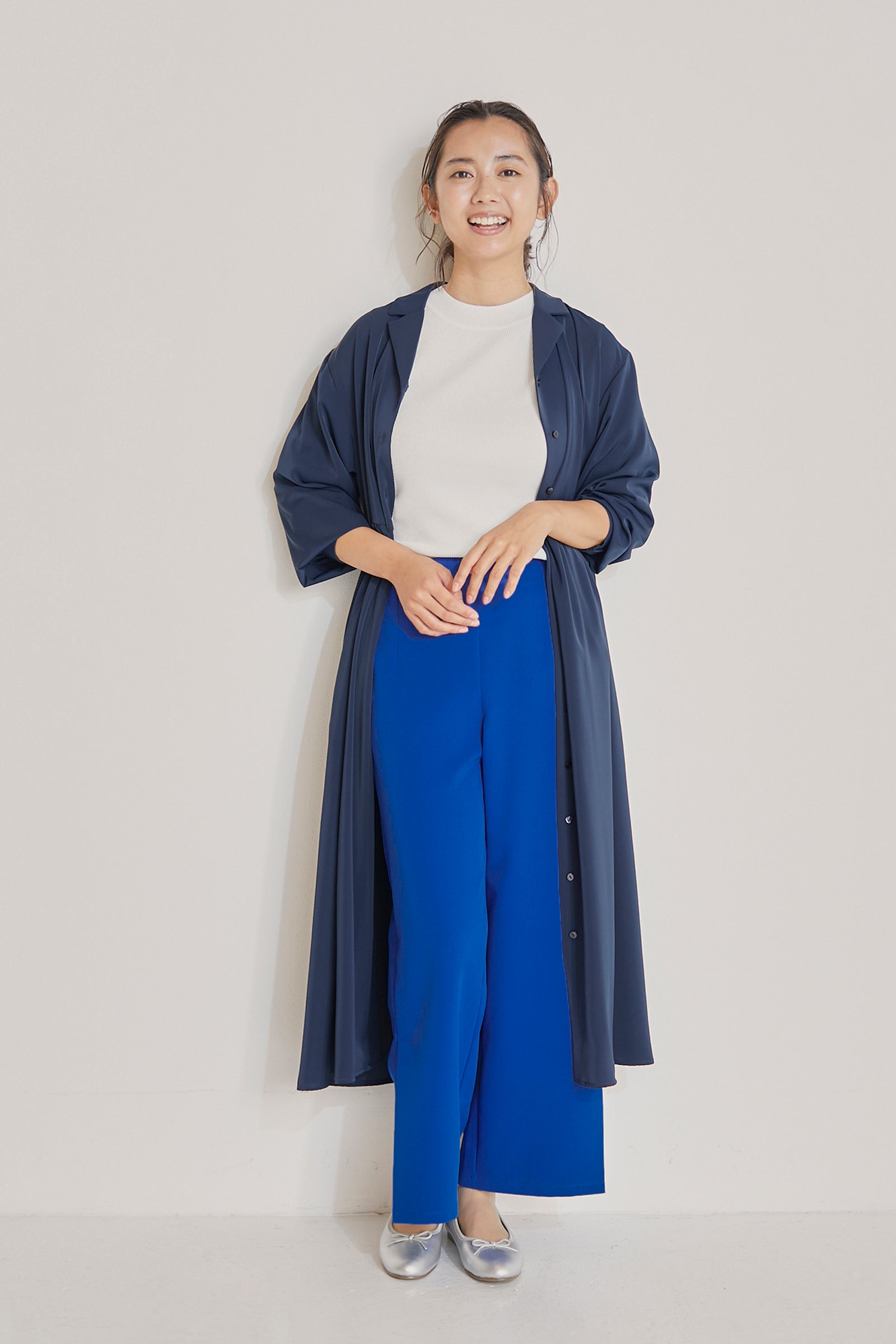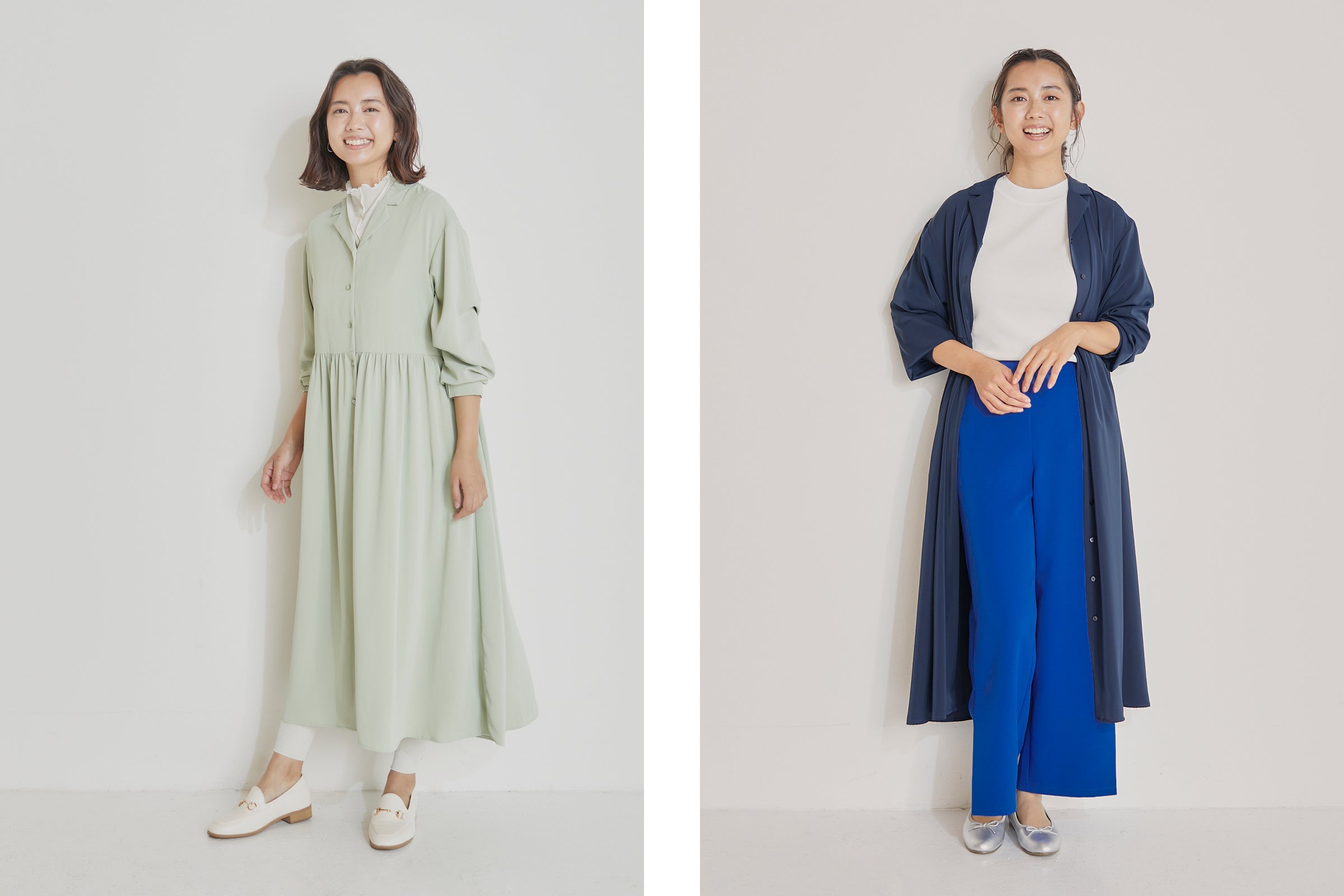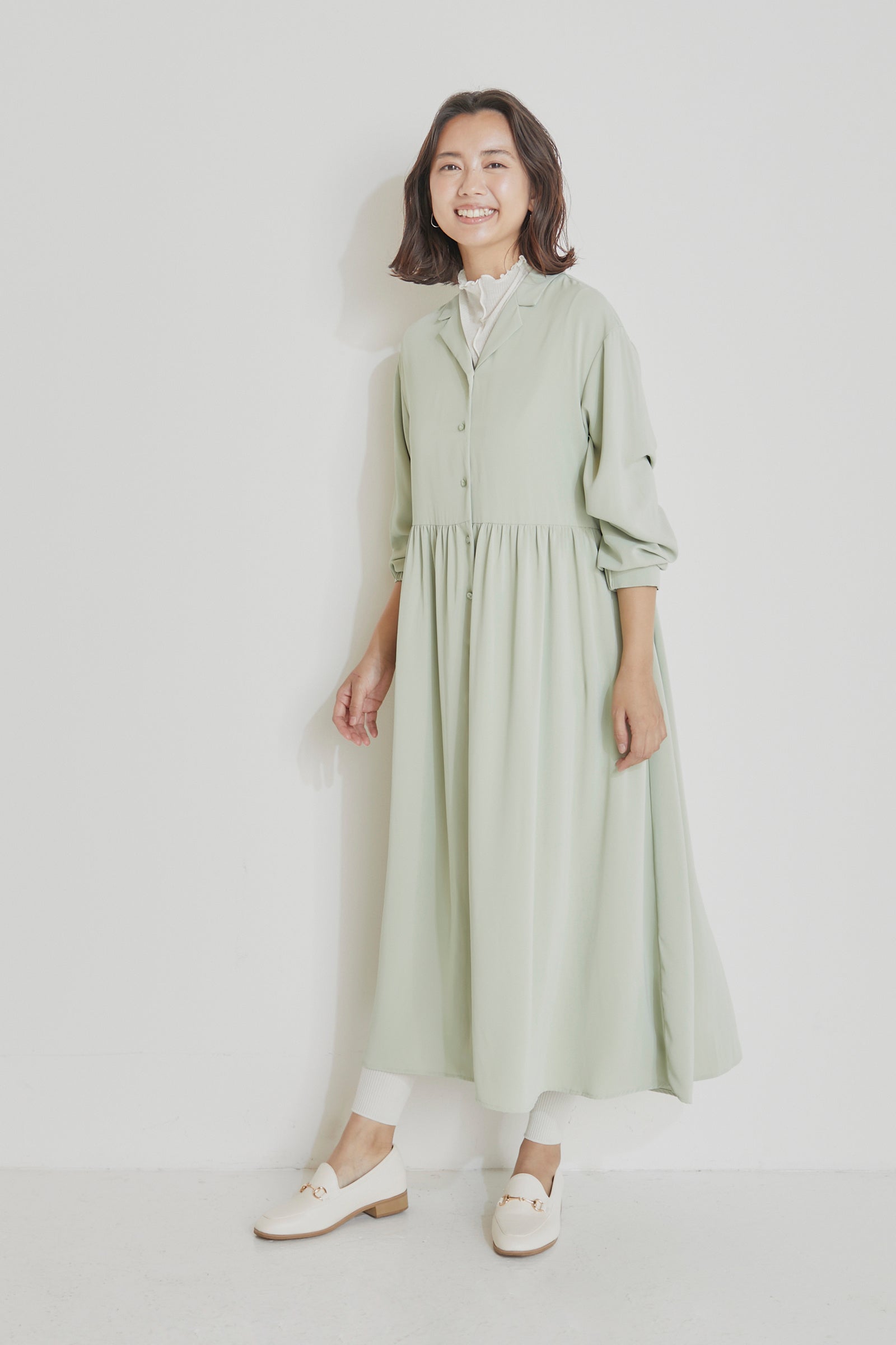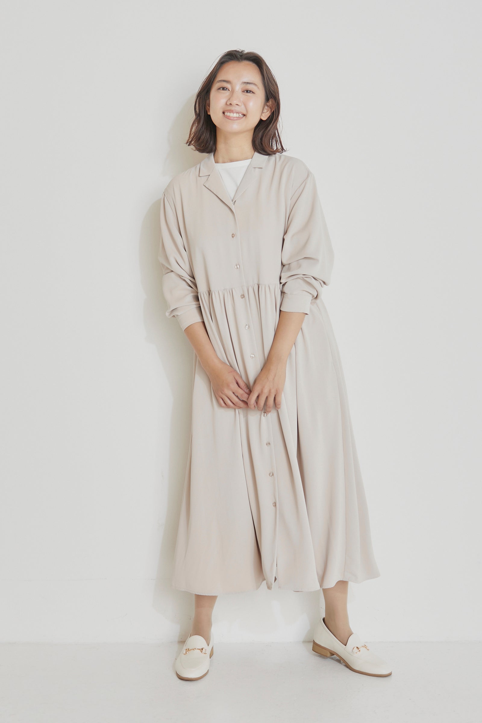 オープンカラーが春らしいシャツワンピース。ハイウエストの切り替えとギャザーで、体型をカバーしながら自然とスタイルアップをかなえます。羽織りスタイルもおすすめです。