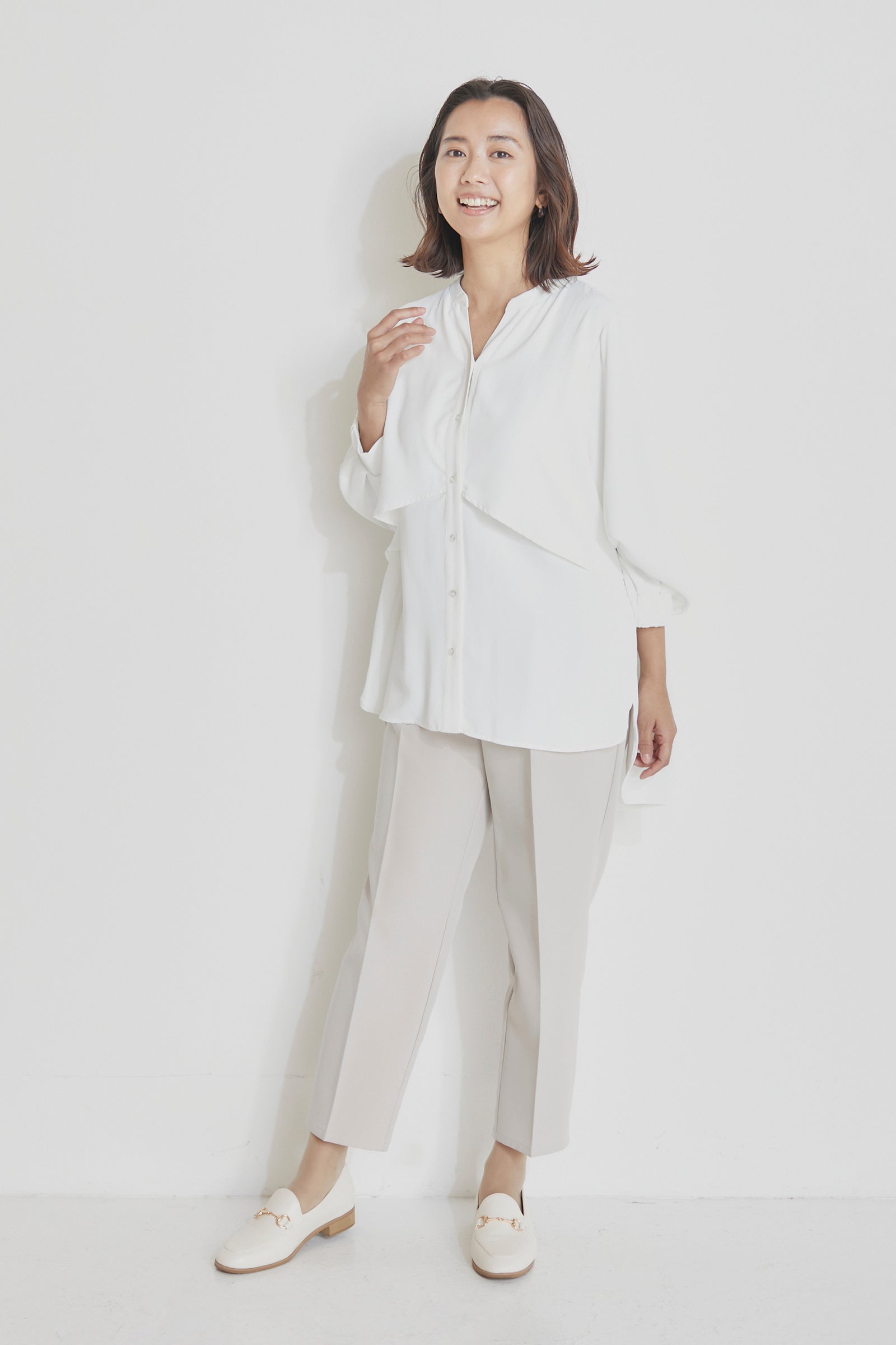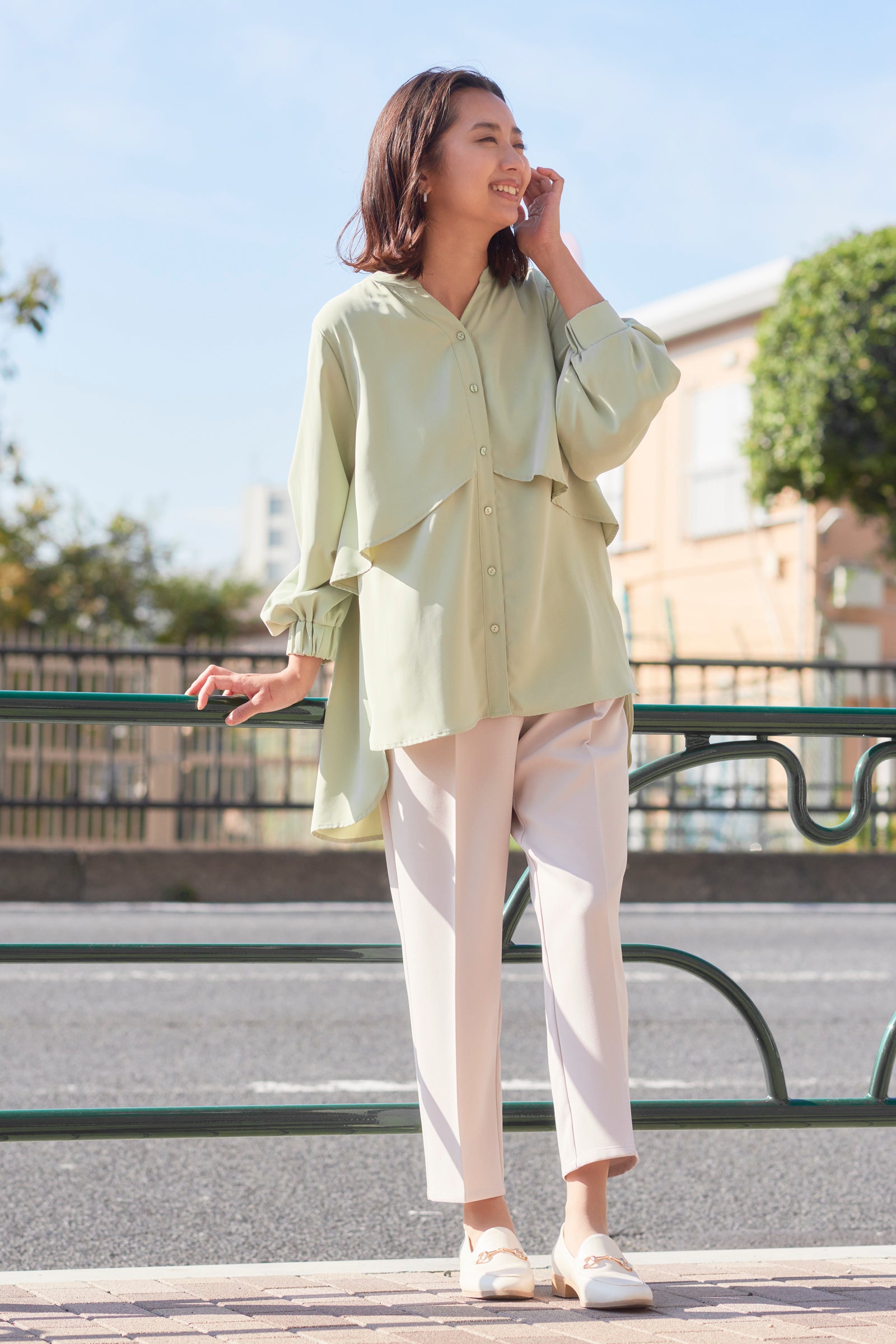 レイヤード風のドレープデザインが華やかなシャツ。V字のネックが顔周りをすっきりと見せ、長めの着丈はヒップ周りの体型をカバーします。羽織りとしても活躍します。