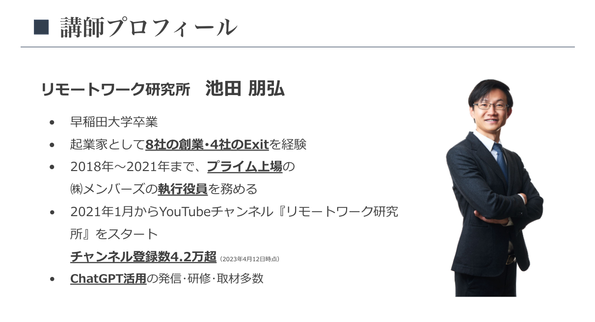 研修コンテンツは、ChatGPT活用方法の発信に定評のある池田朋弘氏が企画制作を担当いたします。