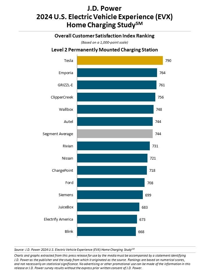 「スタンド・壁掛け240V充電(レベル2)」ではTeslaが790ポイントとなり、4年連続で最も高い評価となった。