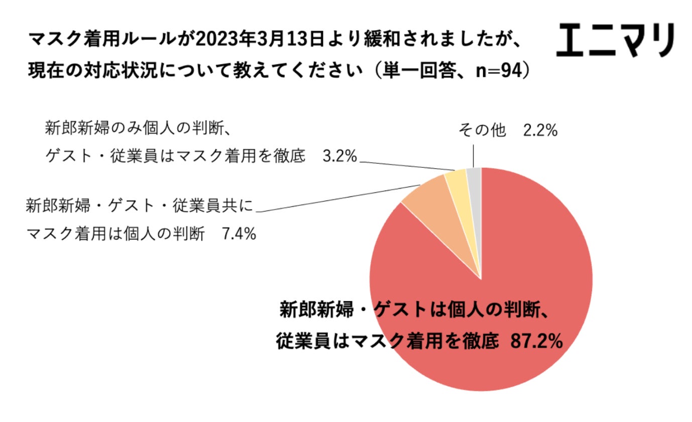 マスク着用緩和から1ヶ月、結婚式場の9割が「新郎新婦・ゲストは個人の判断、従業員はマスク着用を徹底」