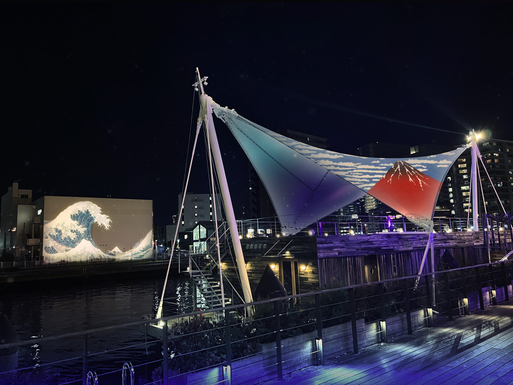 【内容】 「動き出す浮世絵展 TOKYO」(2024年12月21日(土)〜2025年3月31日(月)まで寺田倉庫 G1ビル(東京都品川区)で開催)とのコラボレーション企画として行うもので、天王洲運河両岸の建物や寺田倉庫 T-LOTUS Mの帆に、葛飾北斎の「冨嶽三十六景」シリーズなど世界的に有名な浮世絵や江戸の水辺の風景が描かれた浮世絵をモチーフにしたデジタルアニメーションのプロジェクションマッピング映像を投影します。