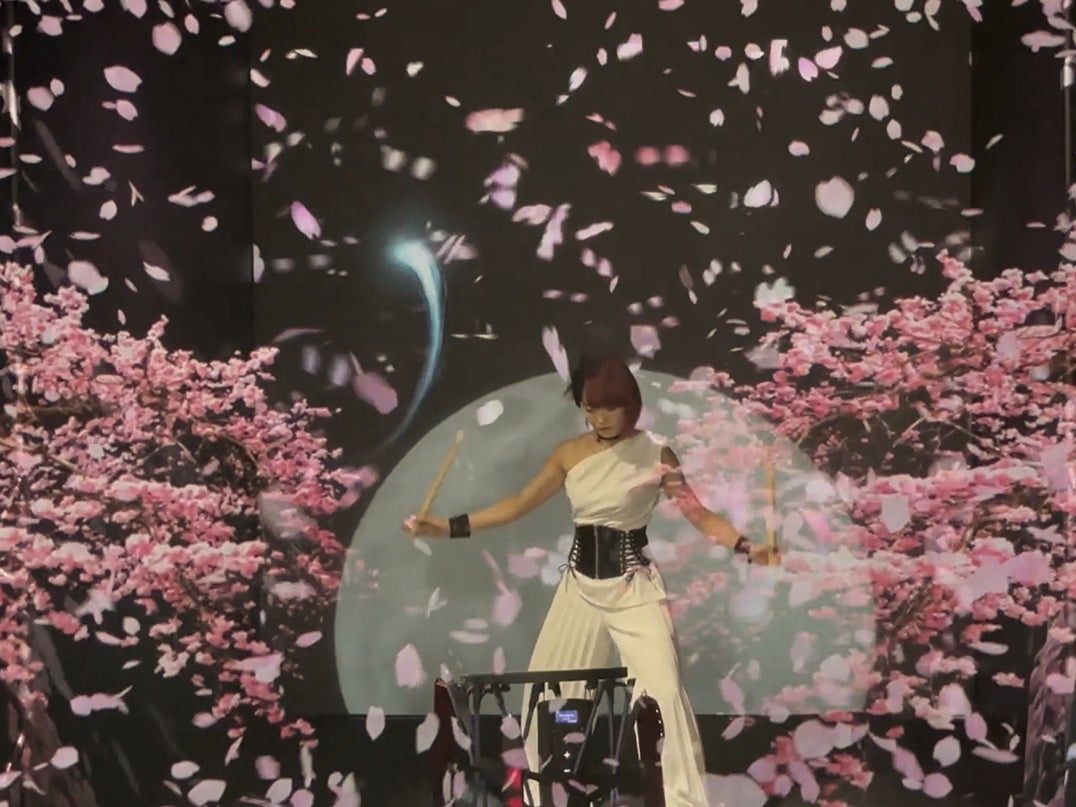 パナソニック コネクト株式会社の独自技術により、太鼓奏者のバチの動きを赤外線カメラで検出して追従。その位置情報をすぐさま、演者手前のメッシュスクリーンに映像投写し、「太鼓奏者の動きと音にあわせた演出」と「空間に浮かび上がる映像演出」による躍動感ある演奏をお楽しみいただけます。