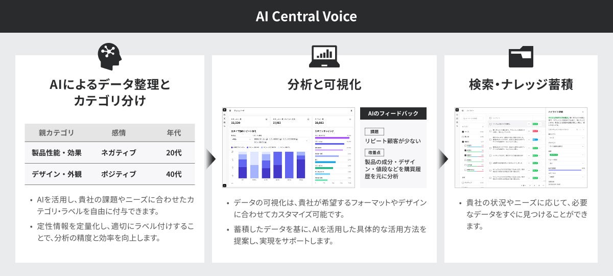 本サービスは、企業内の顧客の声や従業員のフィードバック、営業日報などの定性情報をAIで分析・活用します。データ分析・戦略活用に特化することでAIの精度を高め、業務改善に役立つ具体的な示唆を提供し、意思決定をサポートします。