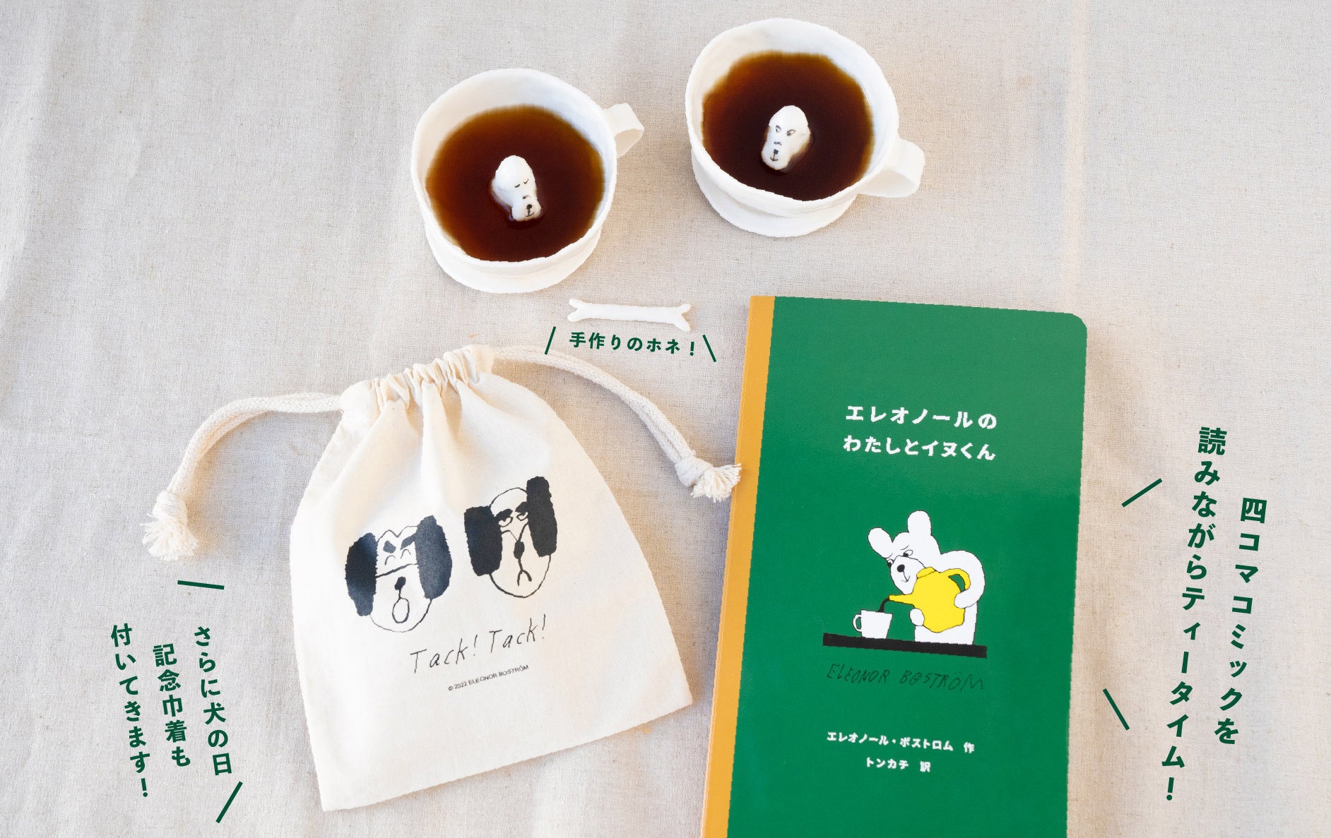 そして今回は、嬉しいノベルティを2種類ご用意しています!まずは、ユーモラスな犬の日記念巾着。そして、定番のカップを2点ご購入で、コミックブックと小さな陶器のホネの置物をプレゼント!もちろん、巾着もついてきますよ。