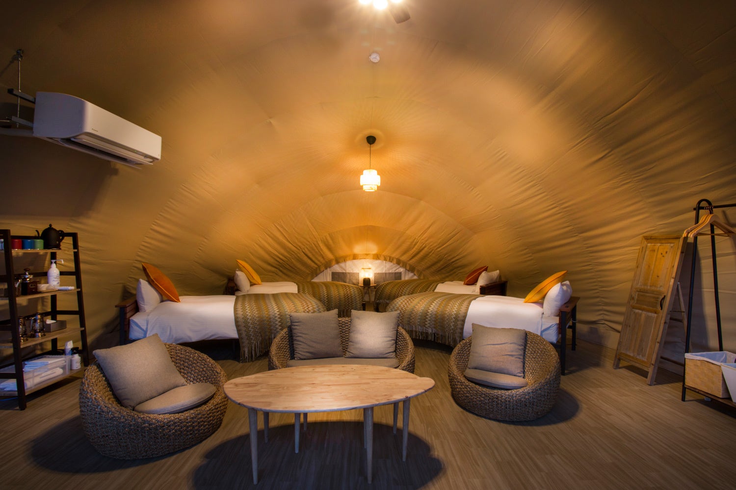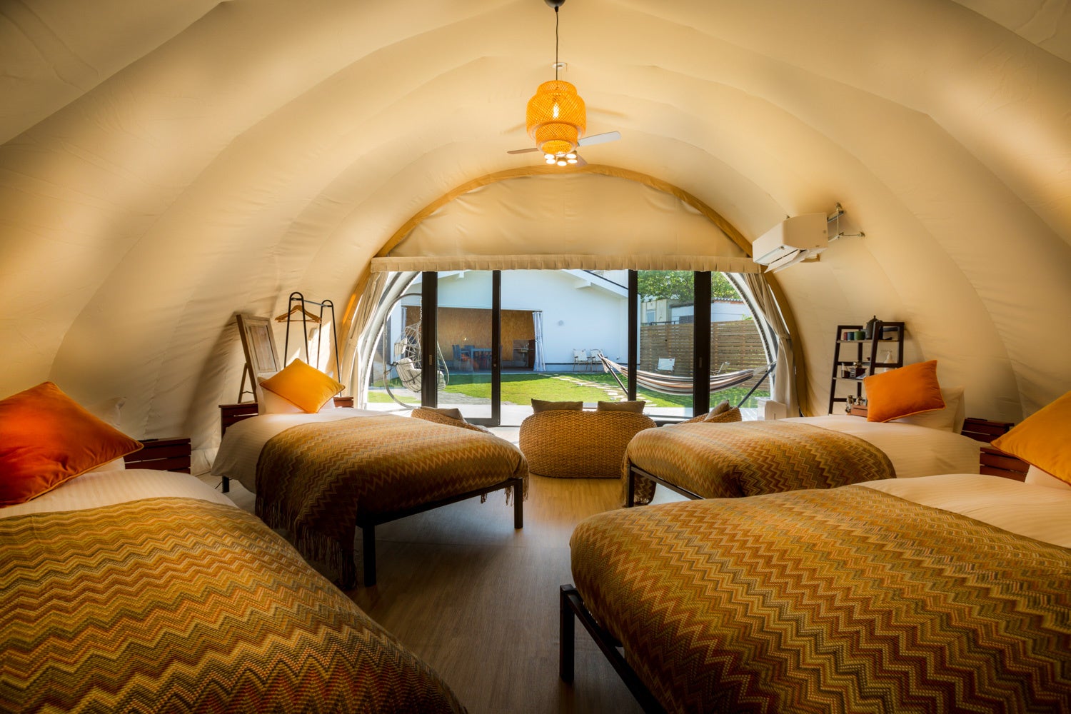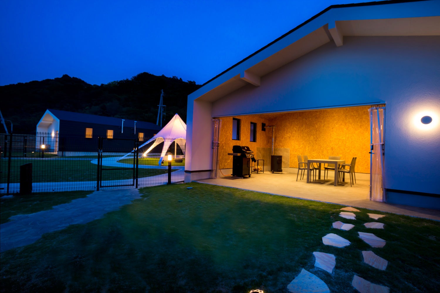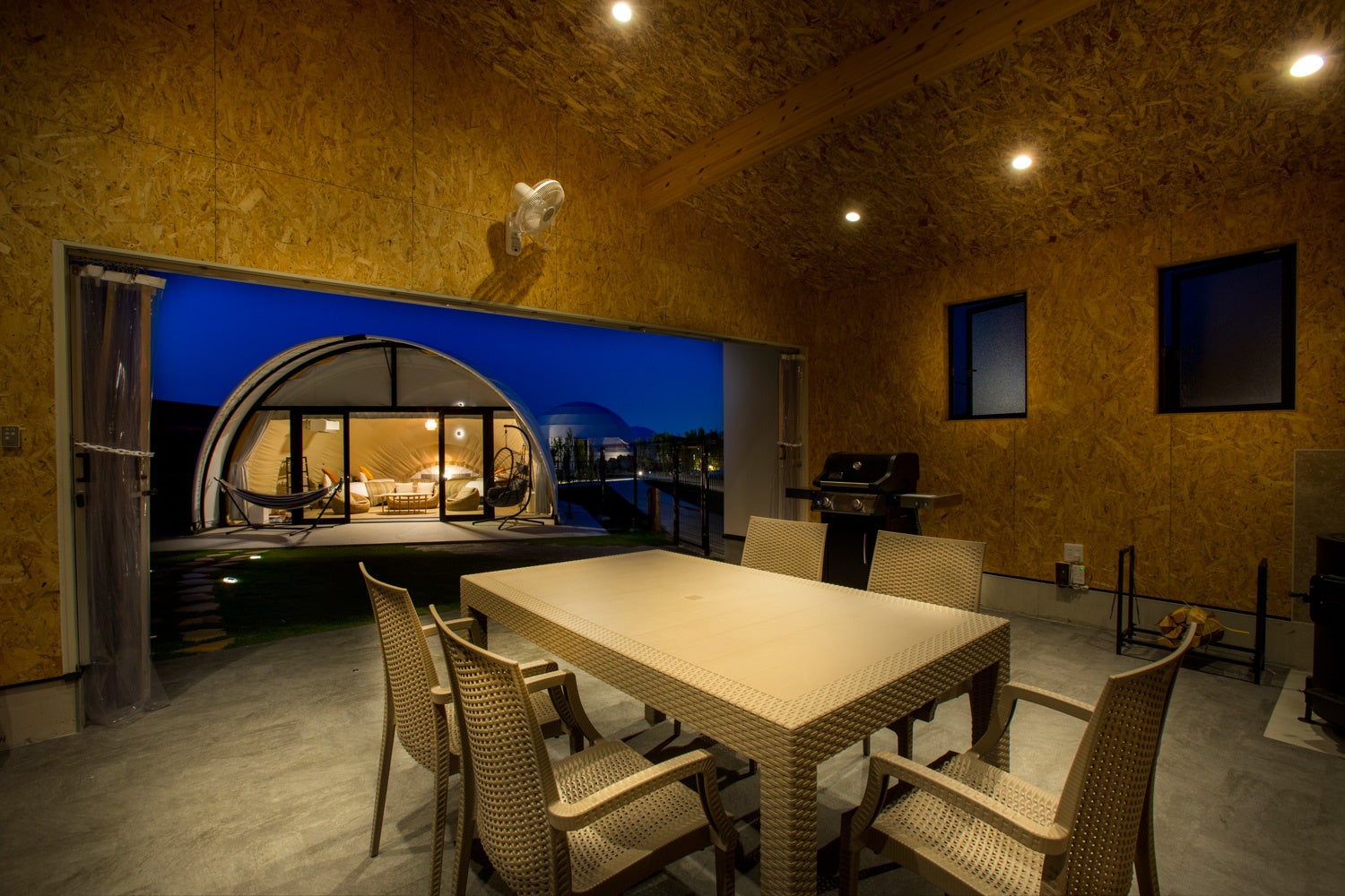 全天候型BBQスペース、バスルームなど充実の専用設備を備えた1棟貸切仕様のコクーンテント。