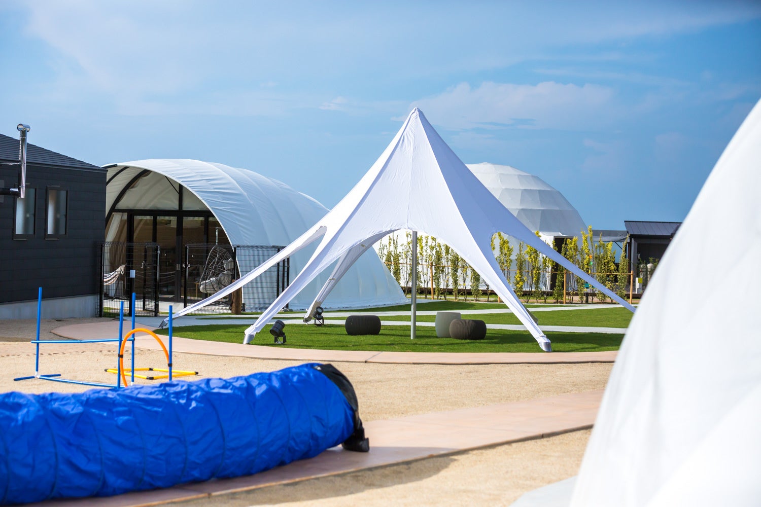 大阪府初の仕様となる繭型のコクーンテントを4棟配置。ドッグランはもちろん、ノーリードでお過ごし頂ける愛犬と飼い主だけの完全プライベート空間を有する【ドッグガーデン】