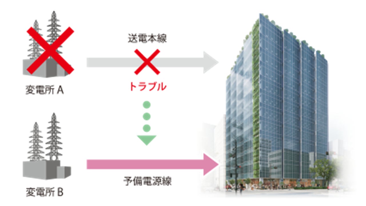 本物件は、建築基準法の1.5倍相当となる耐震性の確保(大地震後でも構造体の大きな補修をすることなく使用できることを目標とした建物)、本線が停電した際には自動的に予備電源線に切り替わる「2回線受電方式」の採用、オフィス内に非常電源の供給を可能とする「ビル非常用発電機」や「テナント用非常用発電機設置スペース」の設置、各階の防災備蓄倉庫や地下1階の帰宅困難者用防災備蓄倉庫の設置など、高い安全性能を有しています。