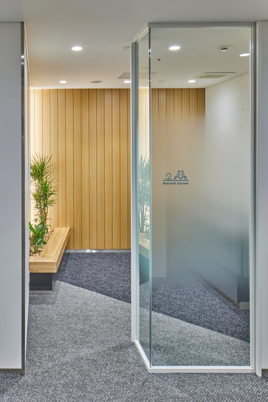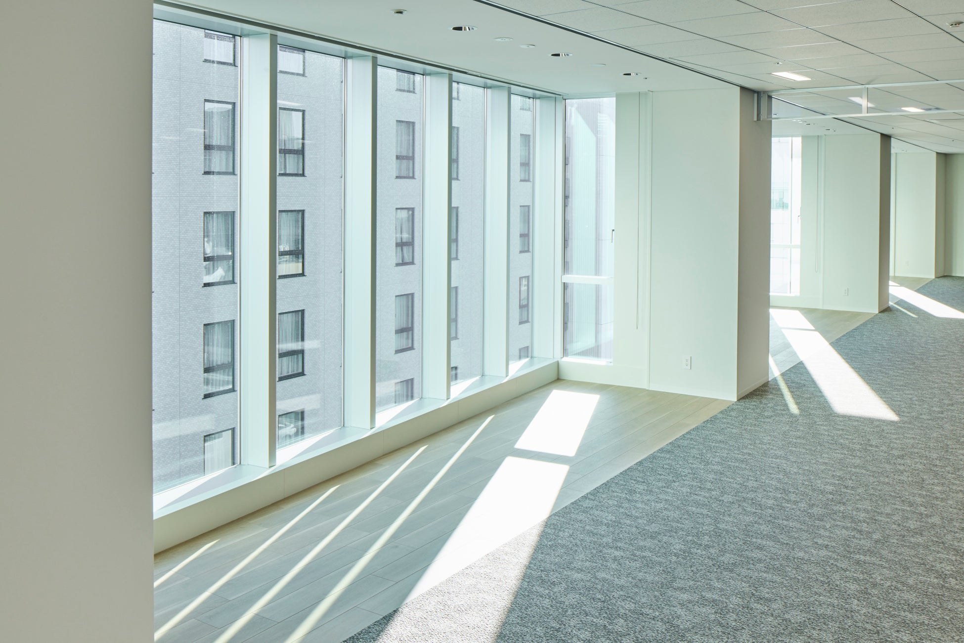 1フロア816㎡(約246坪)、最大で4分割可能な貸室計画で、室内各階の窓際には外装の雁行形状を活かしたインナーバルコニーや心地良い風を取り込める自然換気窓を設置しています。また、フロア共用部にはリフレッシュコーナーも設置しています。