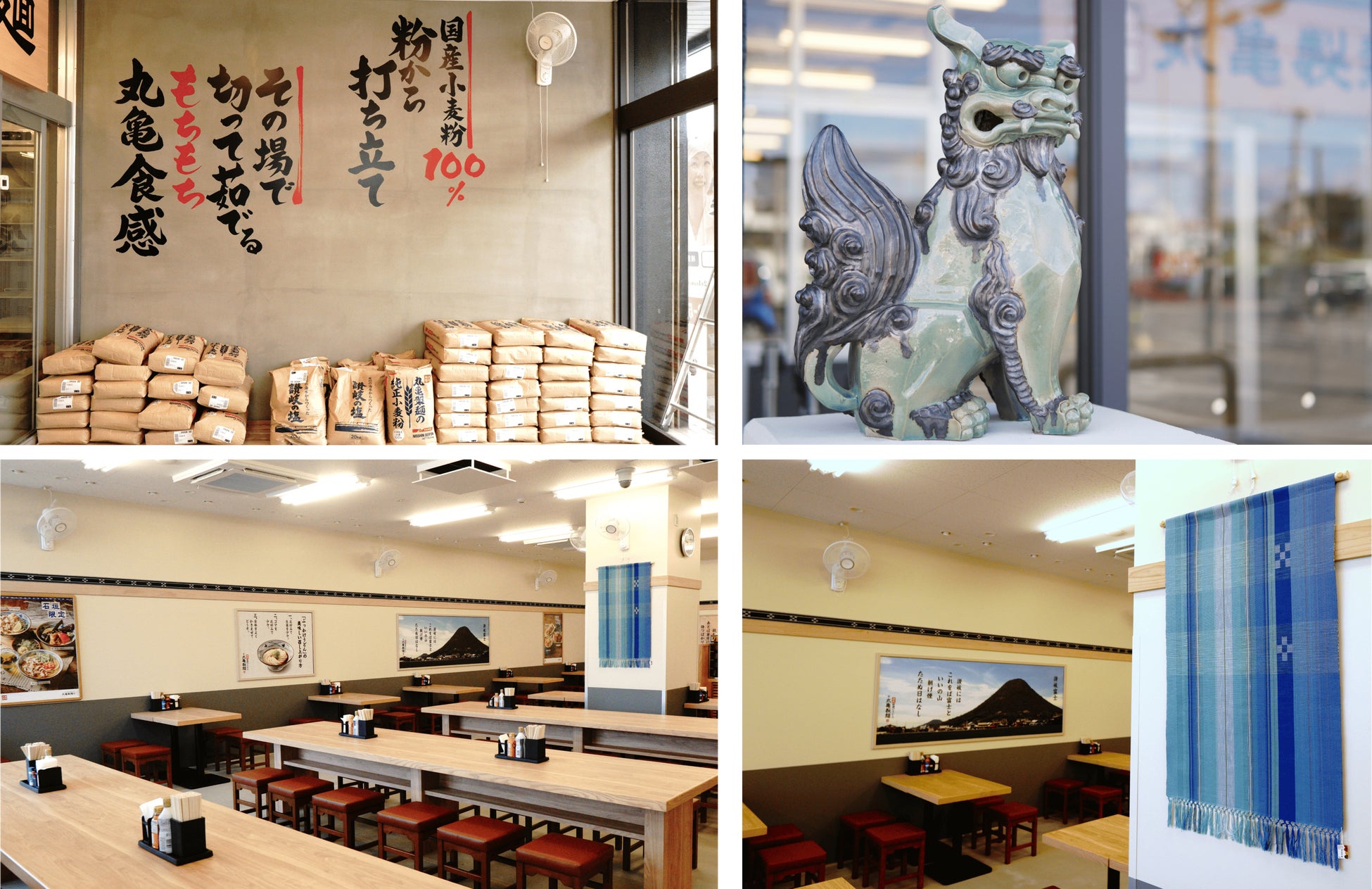 石垣島店は、製麺所ならではの風情感を残しつつも、この土地ならではの文化を取り入れました。まずは、入り口では1対のシーサーがお出迎え。そこから中に入ると、厨房で職人が粉からうどんを打ち、切って、茹でるといった一連の製麺や手づくりの調理を行う厨房が目の前に広がります。客席には、地元の織職人がこのために制作した手織りの22メートルにも及ぶ石垣島の伝統織物「八重山ミンサー織り」が壁に飾られています。他にも、「八重山ミンサー織り」のタペストリーや民芸品を展示しています。