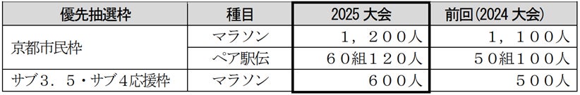 また、今大会は、優先抽選枠である「京都市民枠」及び「サブ3.5・サブ4応援枠」を増員し、皆様の御応募をお待ちしています。