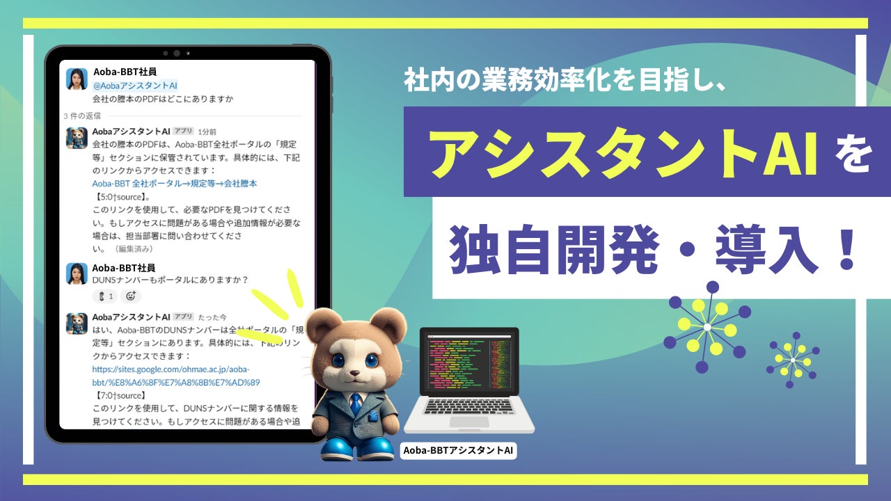 その一環として、独自に開発・導入した「Aoba-BBTアシスタントAI」は、OpenAIの技術を活用したSlackボットであり、社内コミュニケーションの円滑化や業務の効率化を促進するツールです。