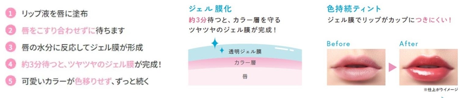 リップカラーを唇に塗布して約3分待つことで、唇の水分に反応してカラー層の上にツヤのある透明ジェル膜が形成されます。ジェル膜の効果で色移りせず、つけたてのきれいな発色がつづきます。