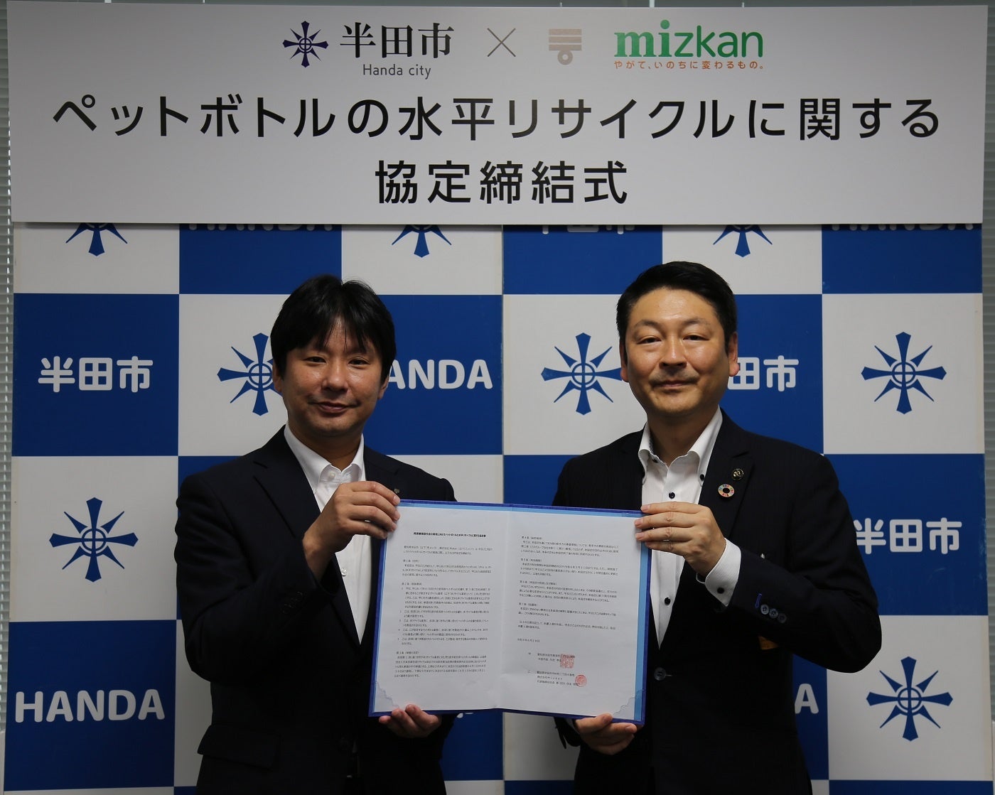 愛知県半田市(市長:久世 孝宏、以下半田市)と株式会社Mizkan(本社:愛知県半田市、代表取締役社長兼CEO:吉永 智征、以下ミツカン)は、2023年6月28日(水)に、「資源循環型社会の実現に向けたペットボトルの水平リサイクルに関する協定書」(以下、本協定)を締結いたしました。本協定により、半田市において排出・回収される使用済みペットボトルを「ボトルtoボトル」水平リサイクルにより安定的にペットボトルとしてリサイクルすることにより、半田市における資源循環型社会の実現に役立てることに「ともに」取り組んでまいります。
