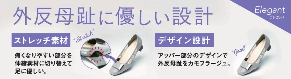 パンプスを中心に、お出掛けやお食事会といったちょっとしたおしゃれの機会にも活躍するような商品を展開します。靴が当たって痛くなりやすい部分を、ストレッチ素材に切り替えて優しい足当たりにしています。またアッパー部分のデザインにより外反母趾が目立ちにくい設計にしています。