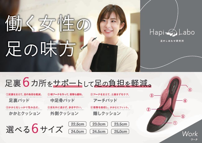 働く方に向けたアイテムとして、パンプスや立ち仕事に適したスニーカーを展開します。インソールで足裏6ヵ所をサポートして足の負担を軽減する設計になっています。通常のパンプスは、歩いているとかかとに隙間ができるためぐらつきが生じやすいですが、本シリーズの商品はかかとクッションでかかとをしっかり包み込むため安定しており、歩きやすさと足の負担の軽減を実現しています。