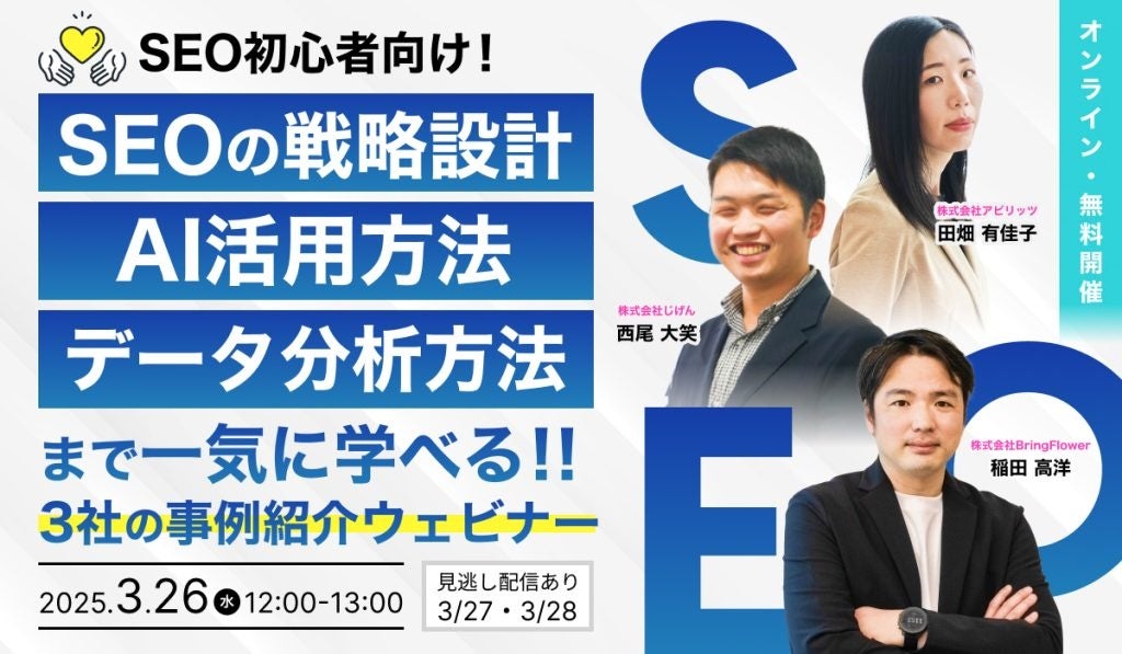 株式会社アピリッツ(本社:東京都渋谷区、代表取締役社長執行役員CEO:和田 順児)は、株式会社じげん(本社:東京都港区、CEO:平尾 丈)および株式会社BringFlower(本社:東京都新宿区、代表取締役:稲田 高洋)と無料オンラインセミナー「SEO初心者向け!SEOの戦略設計〜AI活用方法~データ分析方法まで一気に学べる!3社の事例紹介ウェビナー」を、2025年3月26日(水)12:00より開催いたします。