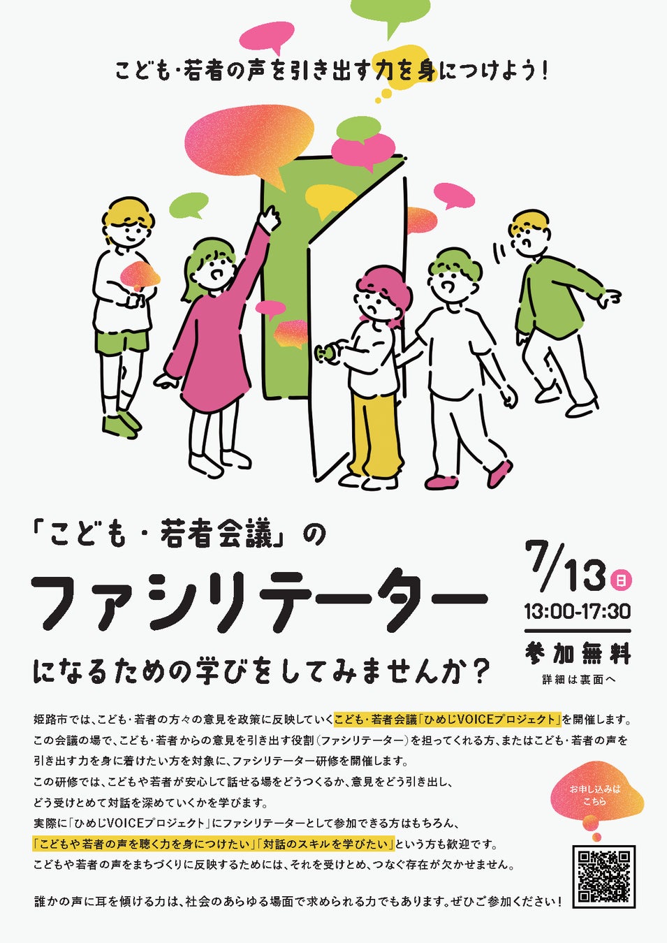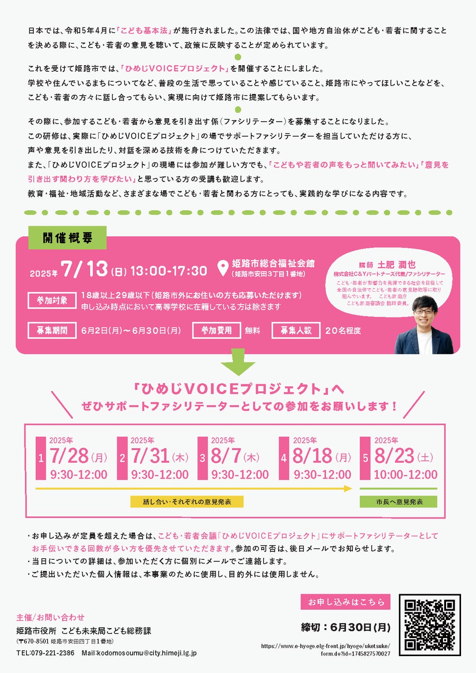 | 募集人数 | 20人程度 (申し込み多数の場合は、こども・若者会議「ひめじVOICEプロジェクト」に サポートファシリテーターとしてお手伝いしていただける方を優先させて いただきます。) |