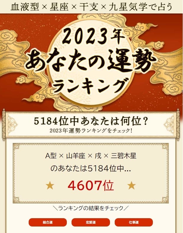 2023年の運勢をランキング形式にして発表します。総合運・恋愛運・結婚運・仕事運を【血液型・星座・干支・九星気学】を使い、5184位のランキングでお伝えします。あなたは5184位中、何位なのか是非チェックしてみてくださいね。