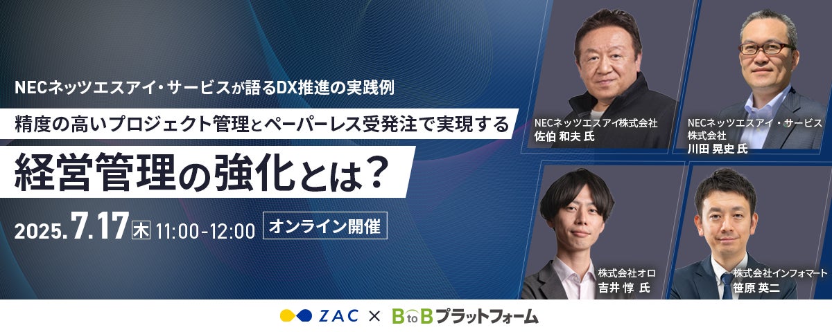 クラウドERP「ZAC」を提供する株式会社オロ(本社:東京都目黒区、代表取締役社長執行役員:川田 篤 以下、オロ)は、オンラインセミナー「NECネッツエスアイ・サービスが語るDX推進の実践例 ~精度の高いプロジェクト管理とペーパーレス受発注で実現する経営管理の強化とは?~」を、2025年7月17日(木)11:00 - 12:00に開催いたします。