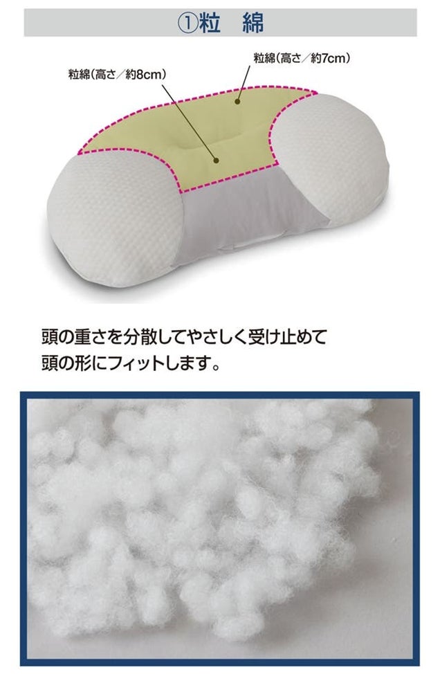 「快眠 五つ星まくら」は、仰向けで寝るときに頭の位置が安定するよう「くぼみ」を作りました。この「くぼみ」と中材のふんわりやわらかい粒綿が、後頭部の丸みに合わせて、やさしくフィットします。