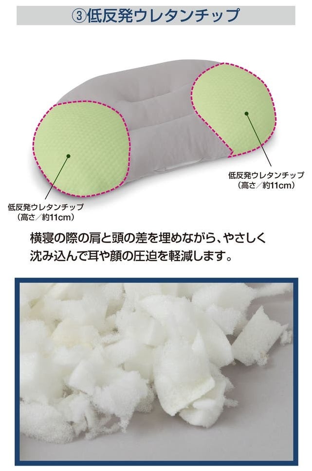 横寝部分の中材には、低反発ウレタンチップを採用!頭と肩の間にフィットする高さで設計しています。