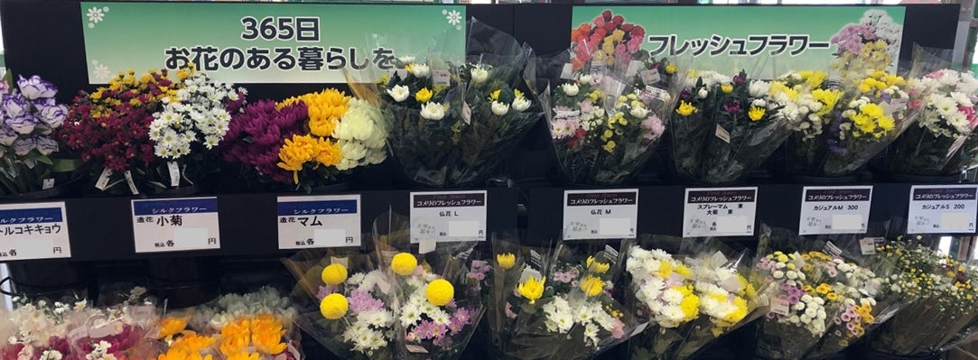 宮城県南部・山形県・福島県・茨城県・栃木県・群馬県・埼玉県・千葉県・東京都・神奈川県・新潟県・富山県・石川県・福井県・山梨県・長野県・岐阜県・静岡県・滋賀県北部・京都府北部のコメリパワー、コメリハード&グリーン598店舗へ自社グループで流通加工した切り花を配送しております。