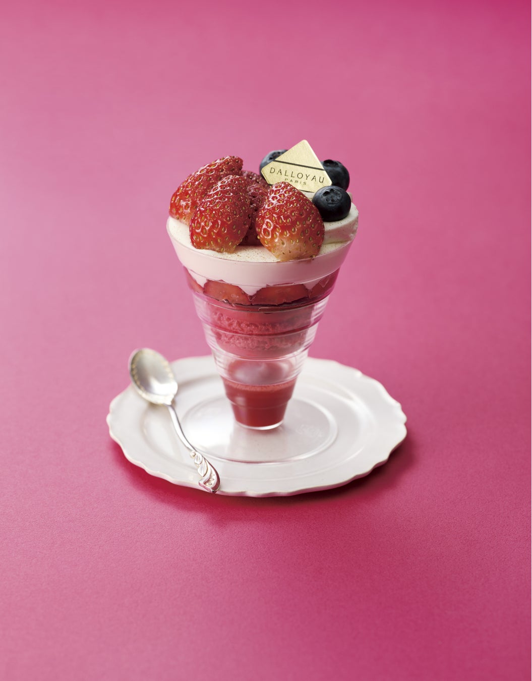 いちごのソース、あまおうのマカロンの上にいちごのコンポートとシャンティークリーム、いばらキッスを飾ったプチパルフェです。