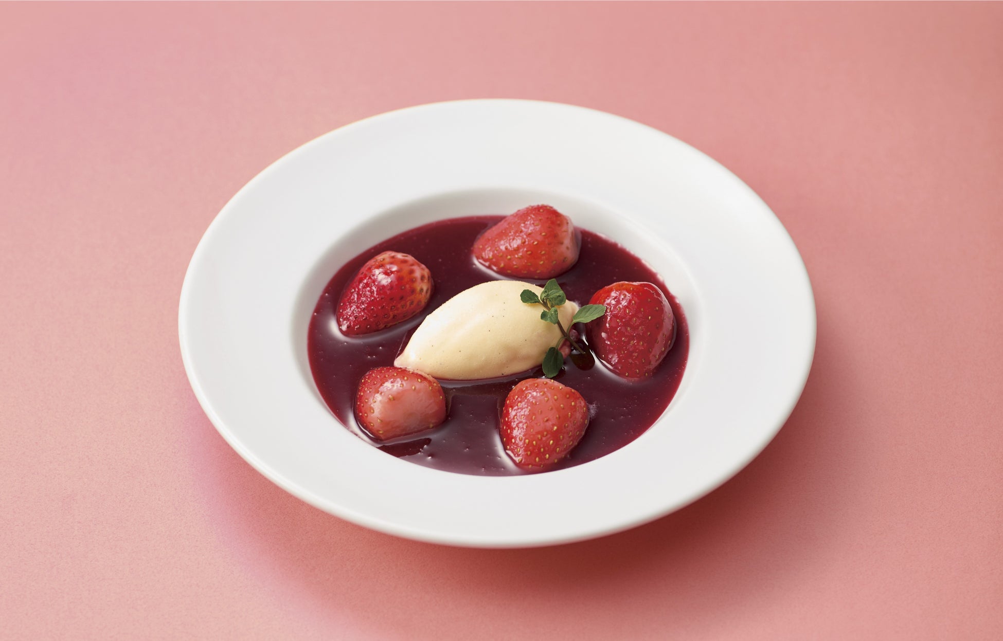 いちごを砂糖でソテーしてからブランデーでフランベし、木苺のソースを纏わせ、バニラジェラートをトッピングしました。レストランだからこそ味わえる逸品です。