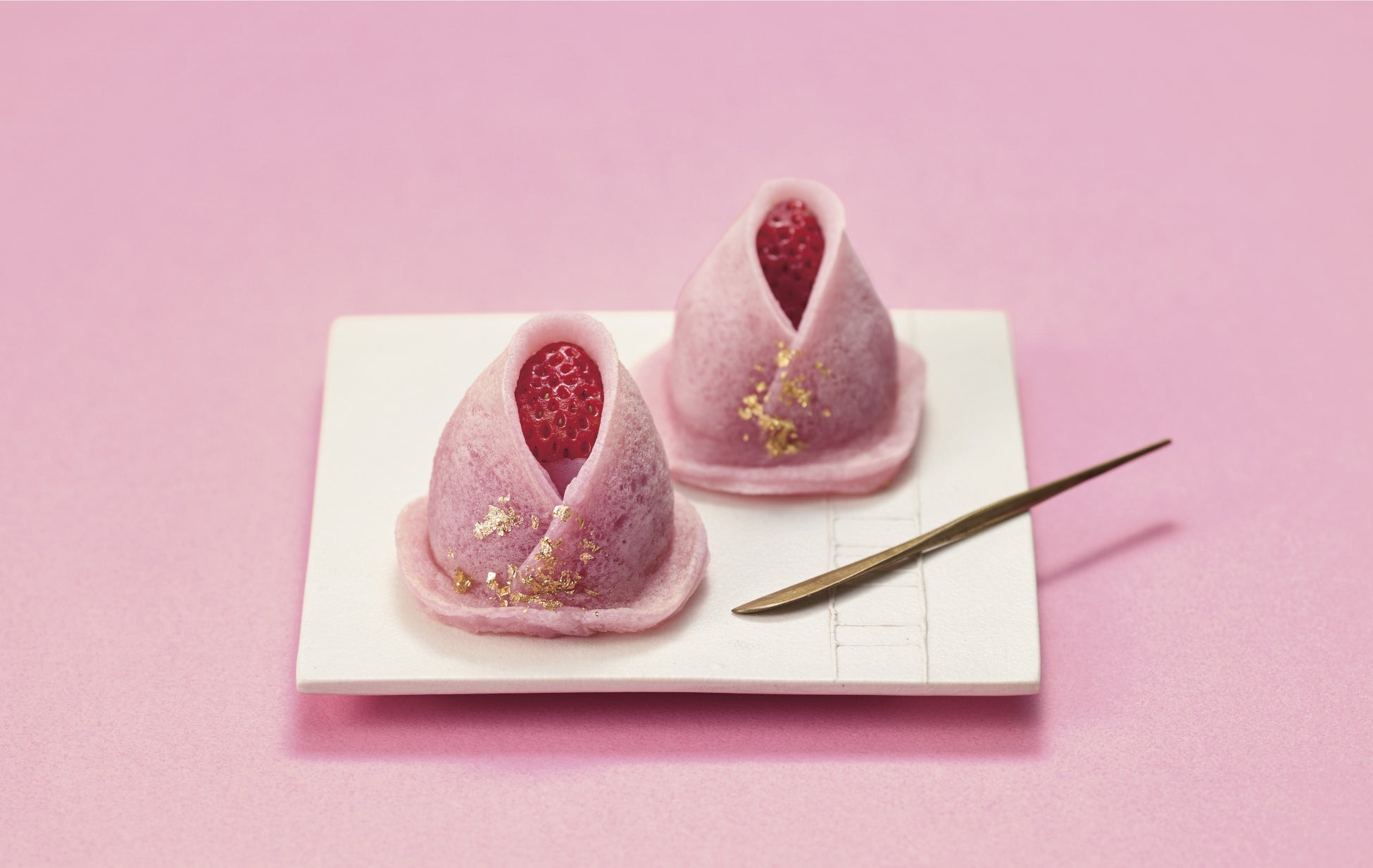 さくらもちの焼き皮でいちご餡といちごを包みました。