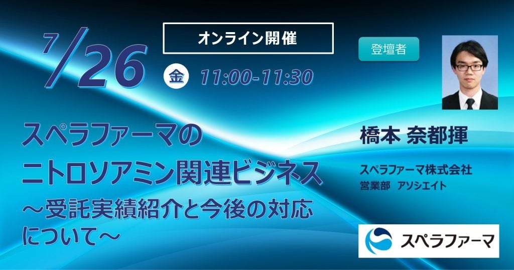 スペラファーマ株式会社(本社:大阪府大阪市、代表取締役社長:岩城 慶太郎)は、2024年7月26日(金)に「スペラファーマのニトロソアミン関連ビジネス ~受託実績紹介と今後の対応について~」ウェビナーを開催いたします。