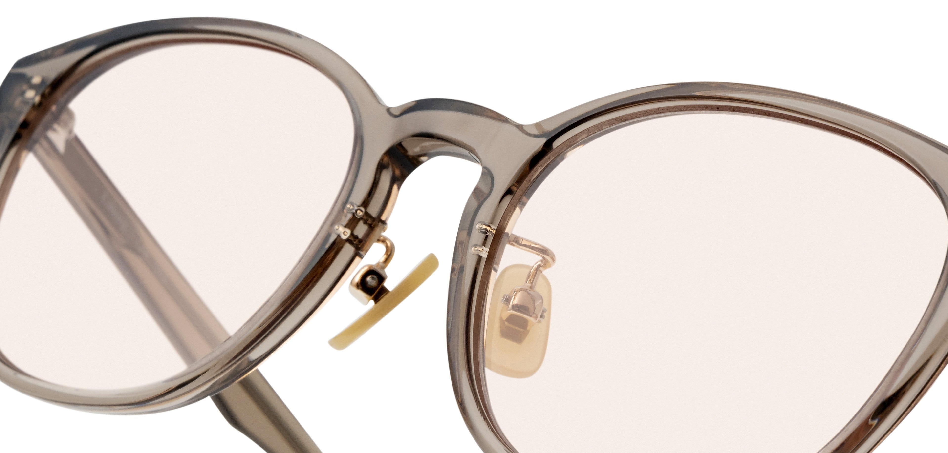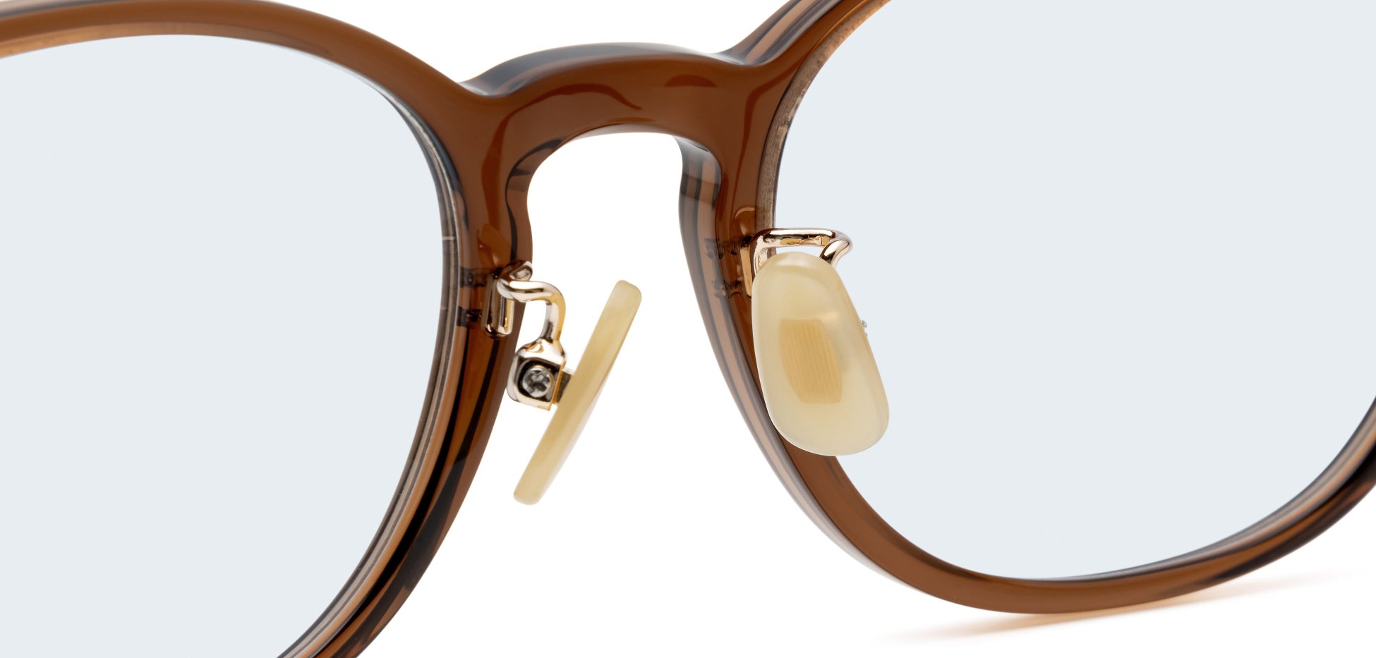 ヘア&メイクアップアーティストの長井かおりさんと、スタイリストの渡辺智佳さんの意見を取り入れ、ゴールドパール色(黄色系の乳白色)の鼻パッドを採用しました。イエベ・ブルベを問わず肌になじみ目立ちにくく、クラシカルな雰囲気も兼ね備えています。さらに、クリングス付きで掛け心地を細かく調整できるため、長時間の装用も快適です。