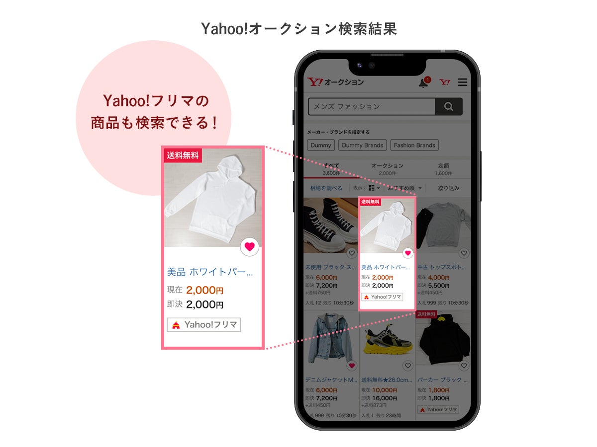 「PayPayフリマ」の商品が「ヤフオク!」上で検索でき、サービスを切り替えることなく購入できます。(※2) ブラウザ版よりリリースし、アプリ版へ順次展開していきます。