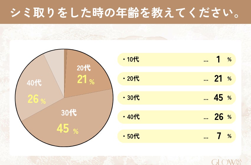 「30代」でシミ取りをした人が最も多く、続いて「40代」「20代」という結果でした。見た目に大きな変化が表れ始める30代が最適な時期だと言えます。