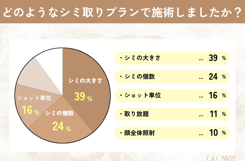 シミ取りのプランに関して、「シミの大きさ」によって料金設定がされているプランを選んだ人が39%と最も多いです。シミ取りの料金はプランによって大きく異なります。