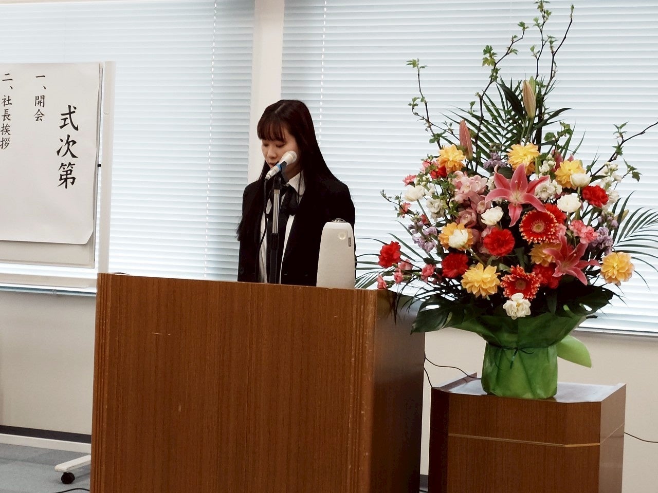入社式では、会長及び役員の祝辞、新入社員代表からの抱負、先輩社員からの激励の言葉がありました。