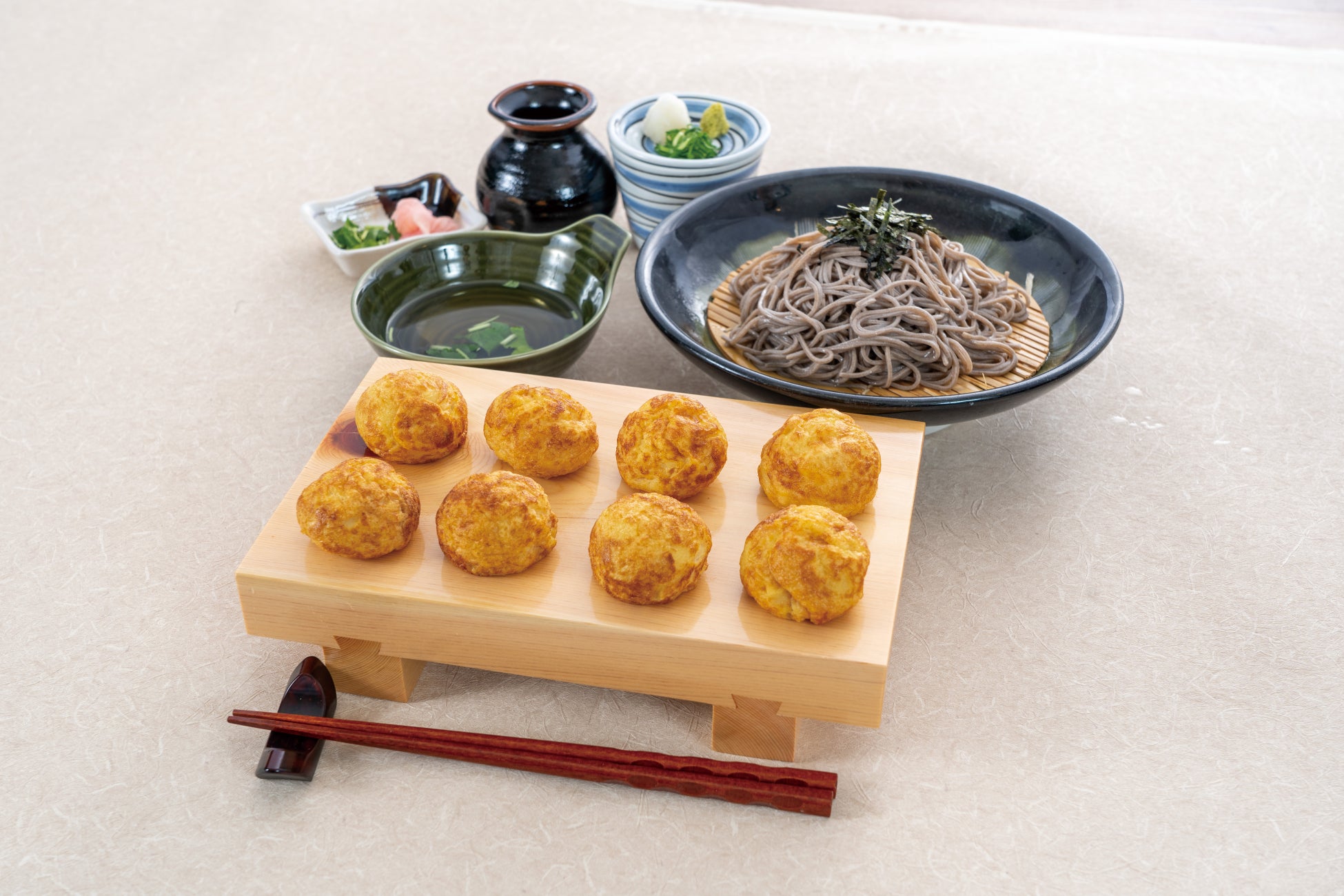 ”特製お出汁”をたっぷり使用した名物玉子焼、特製お出汁を使用したざる返しは二八の石臼引きそばと相性ピッタリ。暑くなってきたこの時期にもつるっとさっぱりお召し上がりいただけます。
