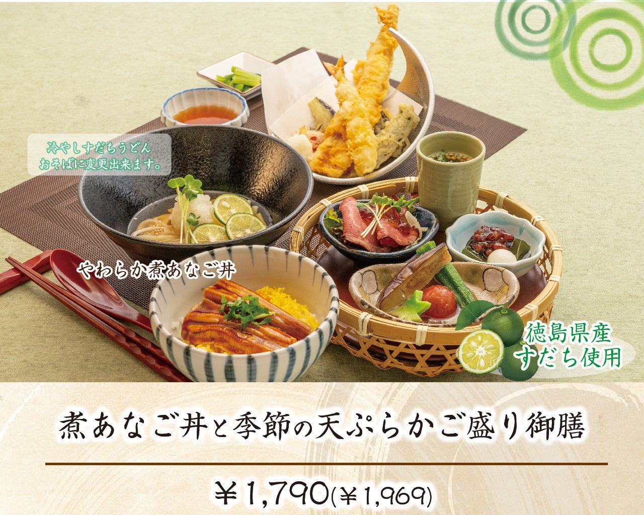 やわらか煮あなごを特製甘たれで絡めた「煮あなご丼」と、サクサクふわふわ食感の真あなごや旬の野菜の「天ぷら盛り合わせ」、この時期ピッタリのすだちとひまわり特製お出汁の冷やし出汁を使用した「冷やしすだちうどん」、ひまわりの特製お出汁を使用した「炊き合わせ」等がついたかご盛り御膳です。