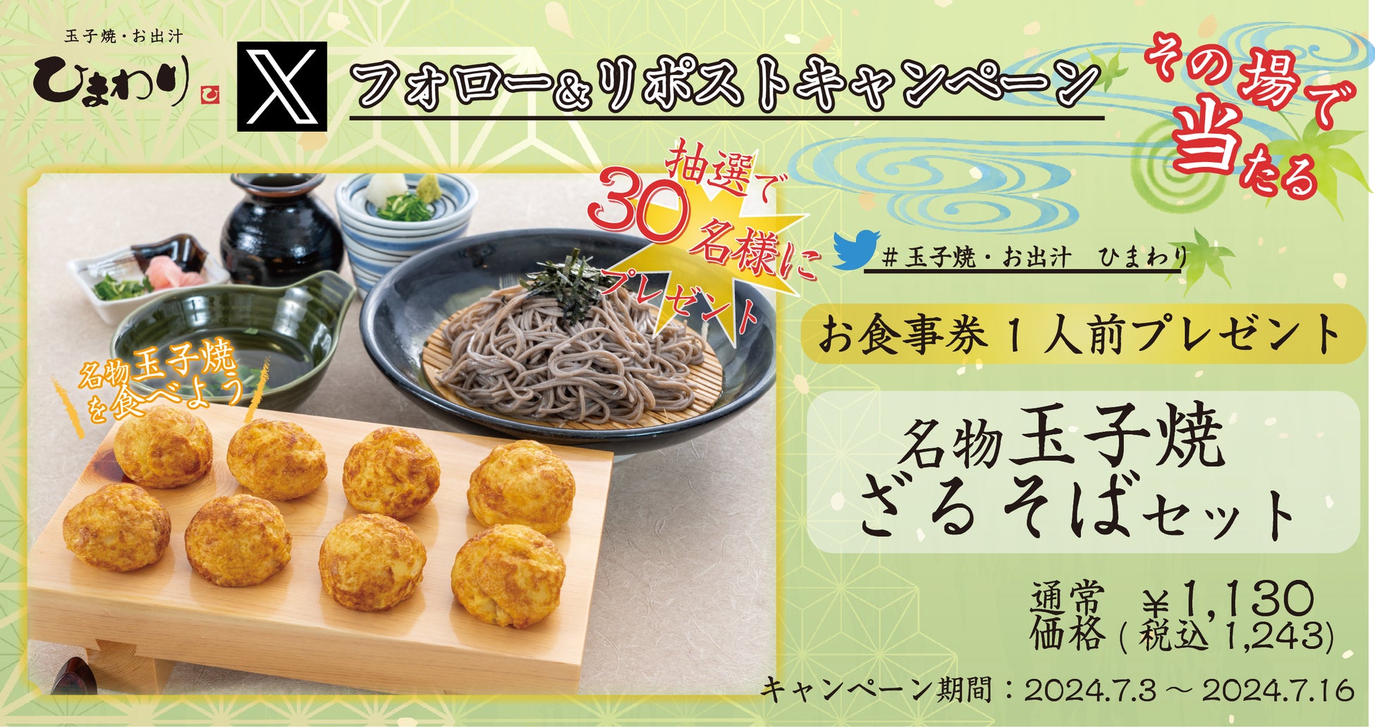 この度、玉子焼・お出汁ひまわり公式Xアカウントをフォロー&リポストして応募すると、抽選で30名様に「名物玉子焼 ざるそばセット1人前(税込み1,243円」をお召し上がりいただけるデジタルお食事券プレゼントキャンペーンを、2024年7月3日(水)より開催します。この機会にぜひご応募ください。