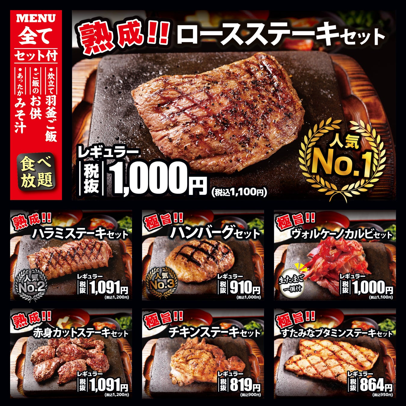 熟成ロースステーキセット 1,000円(税込1,100円)は、羽釜ごはん・味噌汁・ごはんのお供のセットで圧倒的満足度を実現。