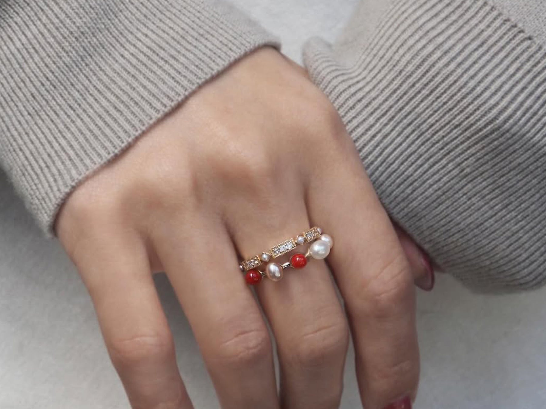 古くから日本で親しまれてきた真珠と珊瑚をあしらい、カチューシャリングを仕立てました。