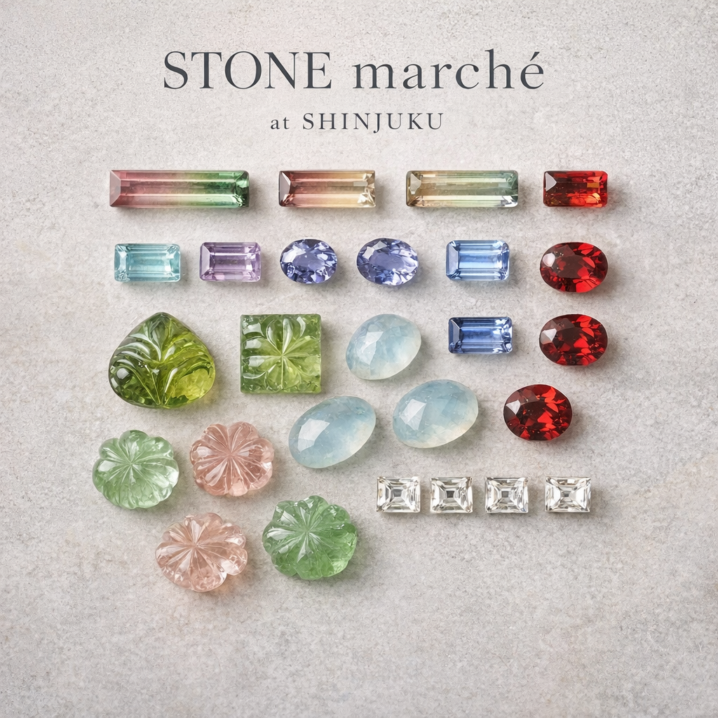 3月21日(土)・22日(日)には、約100石の天然石ルースが並ぶ人気イベント「STONE marché」を開催いたします。3月は「お花見マルシェ」をテーマに、春の花々を思わせる色彩の宝石をご紹介いたします。色や透明感、カットの違いなどを見比べながら、お好みの宝石をお選びいただけます。
